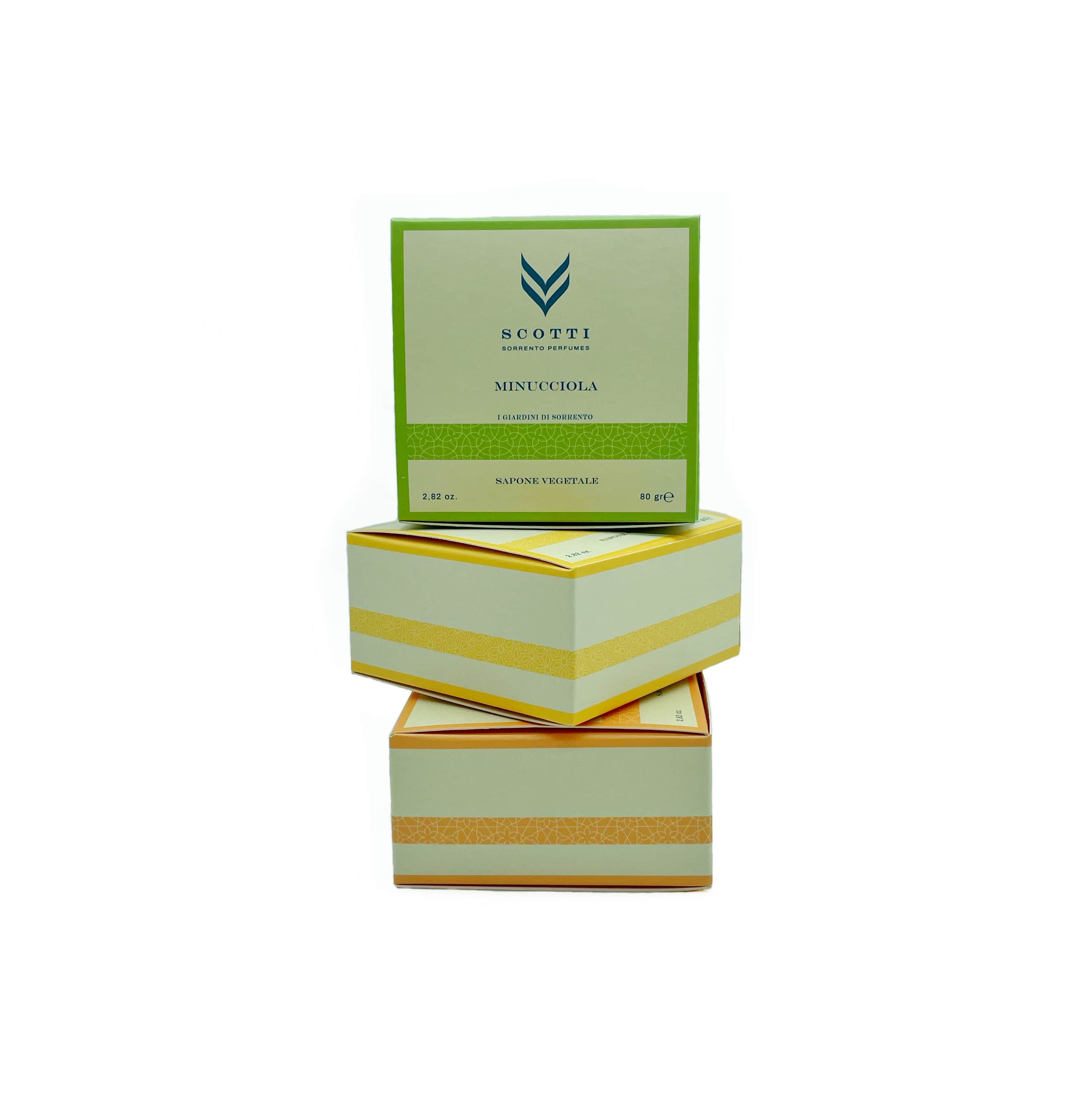 Sapone Fiore d'Arancio Per chi desidera una sensazione delicata ed elegante sulla pelle. Questo sapone è ideale per chi ama le note agrumate e floreali, arricchite con essenze di fiore d’arancio, lavanda, gelsomino, patchouli e legno. Una scelta raffinata che ti avvolgerà in un profumo intenso ed esplicito, portando felicità e allegria ad ogni utilizzo. Sapone Minucciola Per chi desidera una fragranza calda e sensuale sulla pelle. Questo sapone è perfetto per chi cerca un profumo intenso ed esclusivo che accarezzi i sensi e faccia sognare chiunque ti circonda. Lasciati avvolgere dalla sua fragranza unica e irresistibile, ideale per sentirsi speciale ogni giorno. Sapone Limoneto Per chi desidera una sensazione fresca, frizzante ed energizzante sulla pelle. Questo sapone dalle note agrumate è arricchito con essenze pure di limone, scorze di limone e verde. Un sapone che cattura la potenza e la freschezza del limone, trasportandoti in un incantevole giardino di limoni e facendoti assaporare il profumo dei famosi Limoni di Sorrento mentre deterge delicatamente la tua pelle.